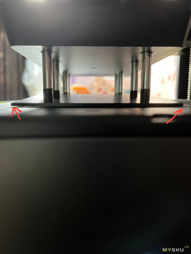 И тут нельзя не заметить, что с конструкцией что-то не то: нижняя пластина наклонена и между ней и корпусом проявляется зазор с палец. Дело в том, что в Mars 5 для отделения детали от плёнки используется смещение ванны вместо поднятия стола. Такие конструктивные решения и раньше встречались, но я впервые вижу подобное в относительно недорогом принтере.