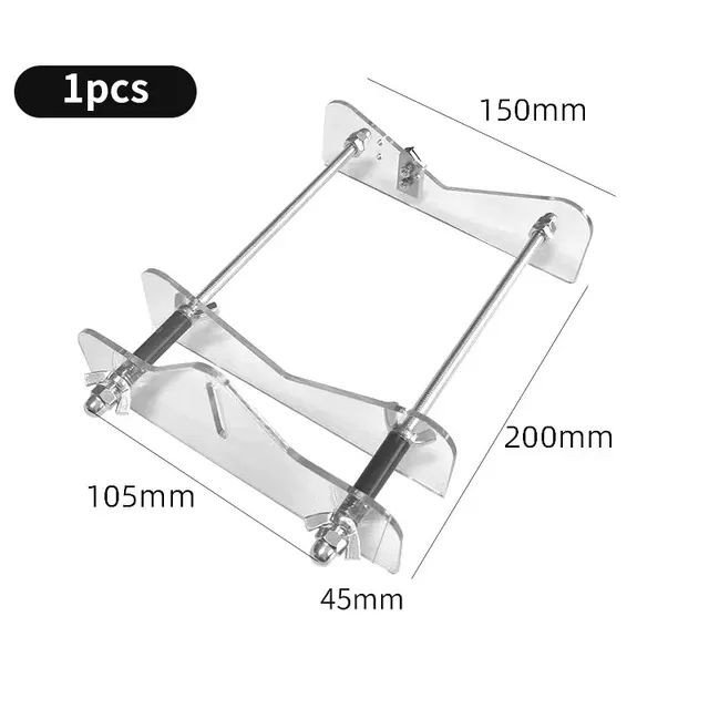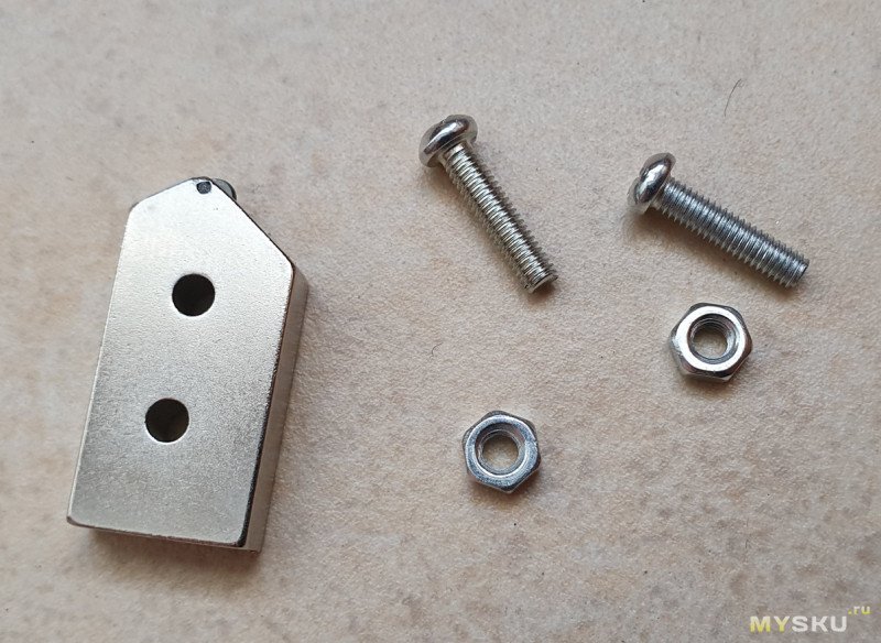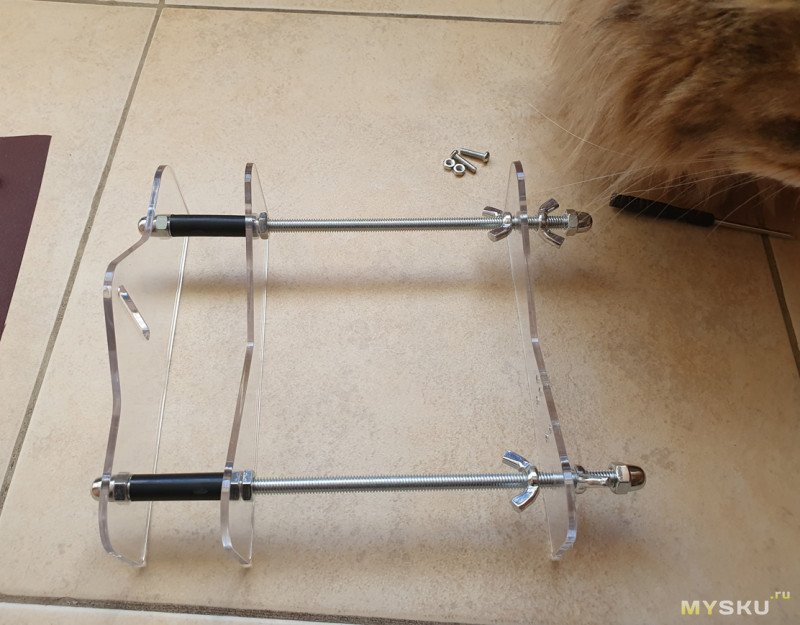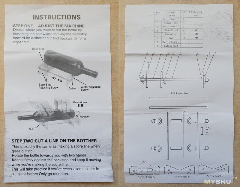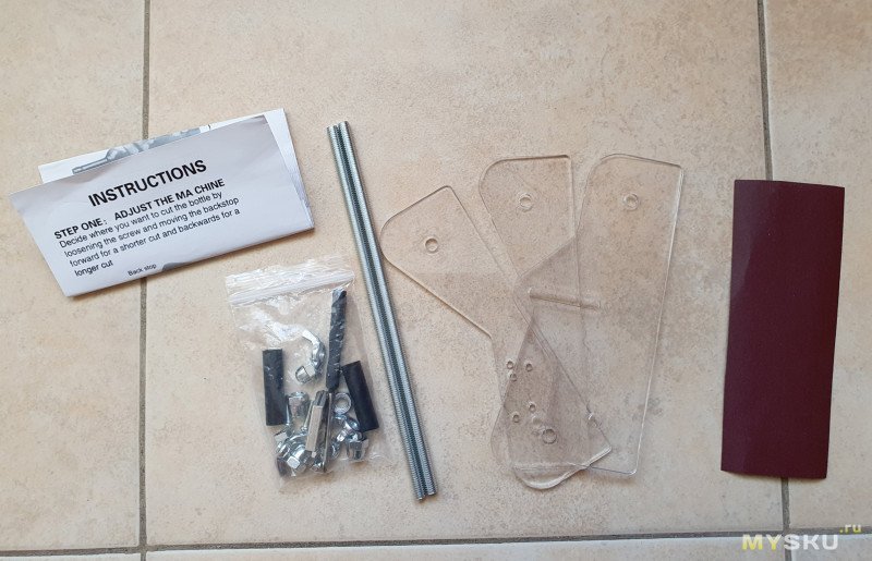 Две направляющие шпильки, три акриловых упора, режущая головка, две проставки, набор винтов и гаек, отвёртка, шкурка и бумажка, носящая громкое название «инструкция»: