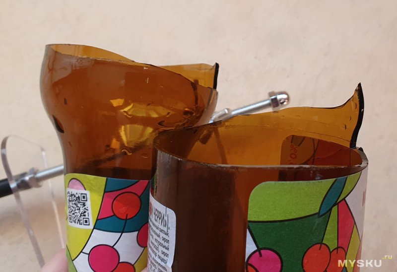 Также обнаружился неприятный момент: акриловые упоры корпуса не обладают необходимой жёсткостью, прогибаются, и вся конструкция «гуляет». И чем сильнее давишь, тем сильнее бутылка может сместиться вбок, так что после полного оборота резец может и не попасть в своё первоначальное положение: