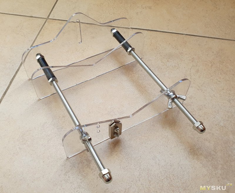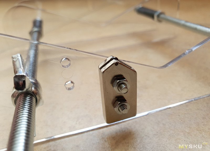 Предусмотрено несколько отверстий для её крепления, чтобы регулировать расстояние от центра в зависимости от диаметра бутылки.