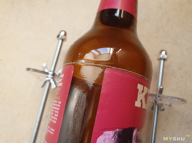 В принципе, стеклорез вполне работает — после некоторых первоначальных попыток я приноровился делать ровную круглую полоску на бутылках. Вот только если вы планируете их «нарезать» много, то лучше поискать более жёсткую и устойчивую конструкцию. А если, как и мне, это надо один раз, то думаю, лучше обратиться в стекольную мастерскую — будет проще, быстрее, надёжнее и, наверняка, дешевле.