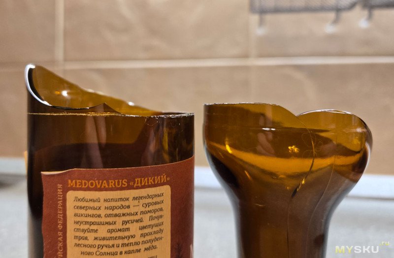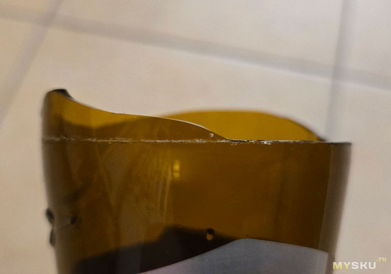 При этом в (You|Ru)tube полно роликов, где всё получается легко и непринуждённо. Пробовал разные способы: не кунать всю бутылку в воду, а поливать кипятком только на линию реза или сначала устроить «контрастный душ», а потом легонько постучать по линии реза — лучше не становилось. Я извёл дома всю ненужную стеклотару, но правильного результата так и не получил. Зато просматривая очередные видео, наткнулся на одно, автору которого я поверил сразу и безоговорочно: