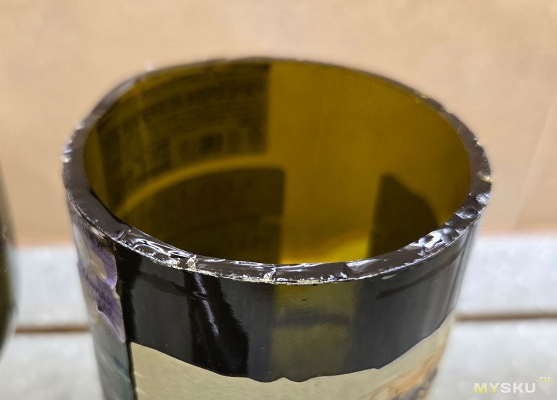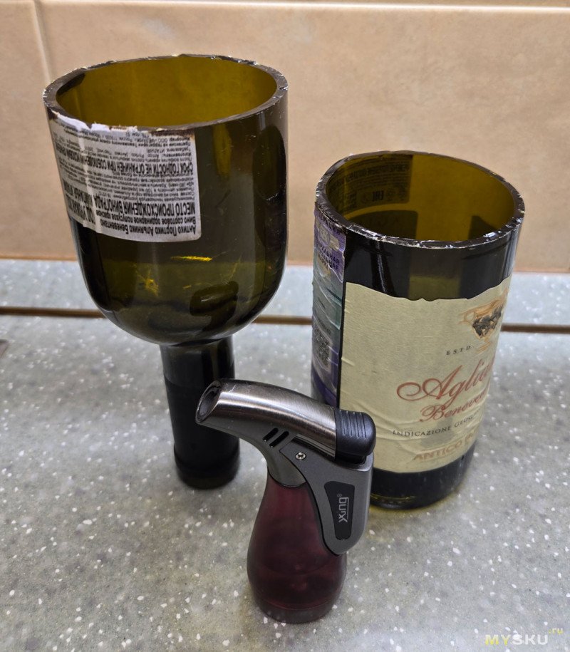 После этого вспомнил одно видео, где автор грел линию реза на обычной свечке, а потом кунал бутылку в холодную воду. У него, естественно, всё получалось быстро и красиво, только бутылка становилась закопчённой. Мне со свечкой возиться и пачкаться не хотелось, зато у меня есть более продвинутый агрегат: