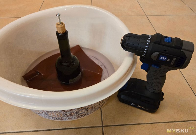 Но поскольку жена просила не горлышко от бутылки, то размышляю над способом, как закрепить в шуруповёрте бутылочное дно. Пока идей нет, скорее всего воспользуюсь насадкой под круглые листы шкурки, а бутылку утоплю в ведре.
