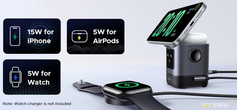 Можно заряжать одновременно телефон + наушники, + часы (при покупке доп.модуля)