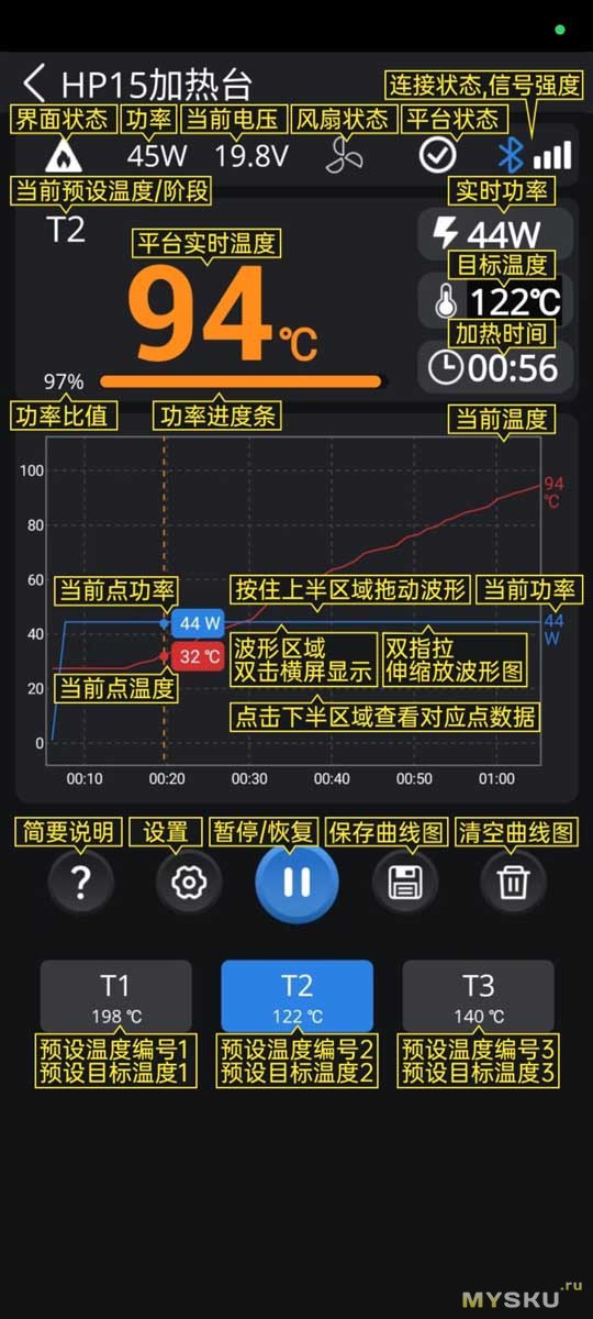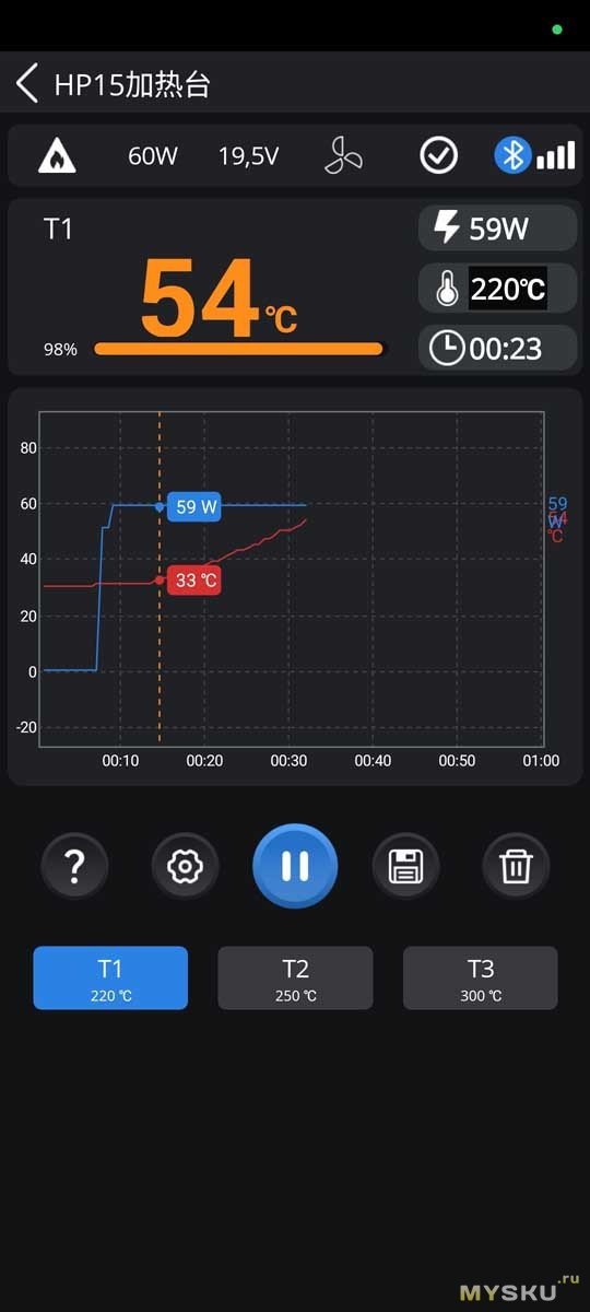 Тут видим текущую температуру, уставку до которой греть, напряжение, реализуемую мощность, и время работы.