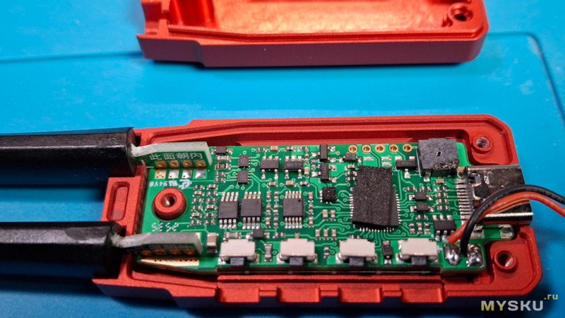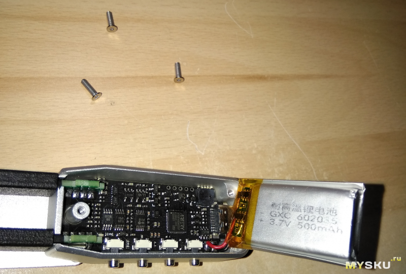 Видна батарея на 500mAh. Видно 4х проводное подключение щупов.