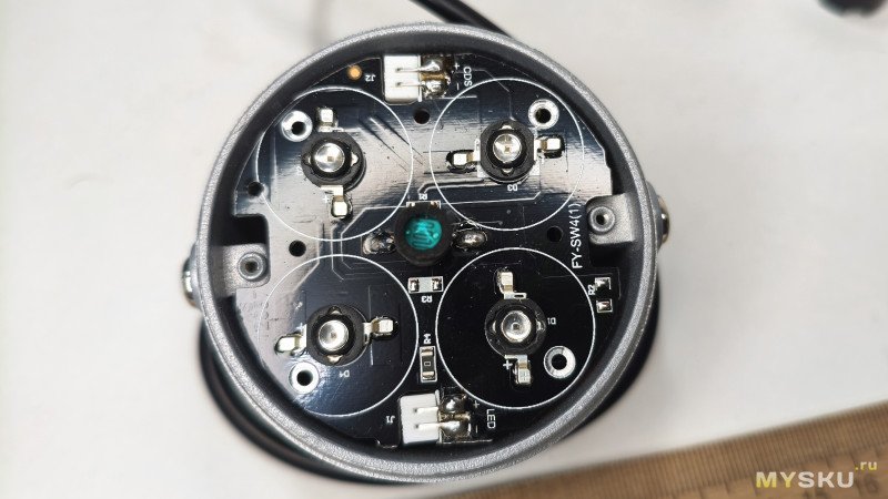 В отличие от предыдущих моделей, здесь плата светодиодов наконец-то не просто болтается в корпусе, а прикручена к латунным стойкам. Еще можно было бы использовать силуминовый (?) корпус для охлаждения, но инженерная мысль до этого пока не дошла.