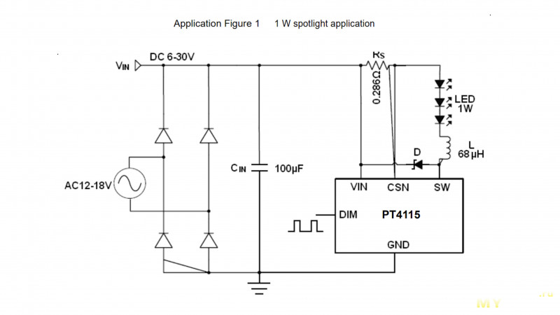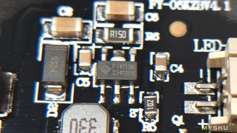 Драйвер собран на хорошо известном чипе UMW PT4115M, даташит. Резистор Rs типоразмера 1206 имеет номинал 0.150 Ом. При желании уменьшить ток — меняем на 0.2 Ом