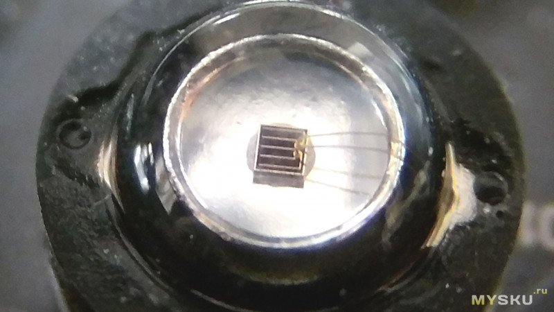 Через силиконовую линзу хорошо виден кристалл светодиода.