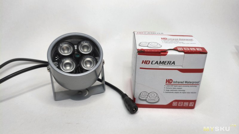 Что же мы имеем? Металлический (силуминовый) корпус, диаметр 65 мм, длина 60мм. Кабель питания 0.5 метра под разъем 5.5 мм, линзы на 60°, светодиоды 850 нм (красное свечение видно невооруженным глазом).