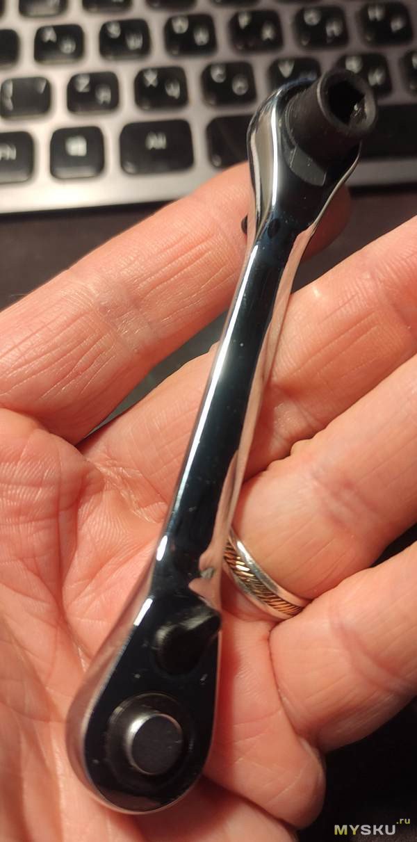 У меня уже был опыт использования похожей трещотки, он был негативный, ключ быстро закончился. Тонкая пластина, которая ограничивает вращение вала в одну или другую сторону, быстро сломалась. Самое хорошее в этом ключе — это черная пластмассовая крутилка, которой можно крутить руками. Но вал в этом ключе вращается очень туго, все кривое и он сделан некачественно.