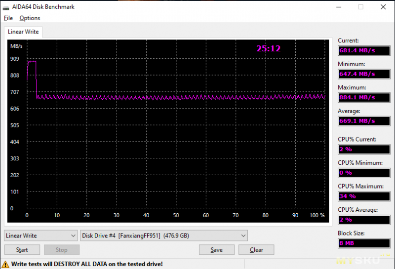 Результат оправдал ожидания, кроме slc-кеша никаких падений скорости нет, до конца ~1100MB/s:
