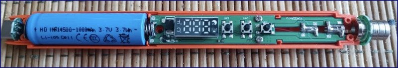В хвосте паяльника есть светодиод, который зеленым светом сигнализирует о режиме работы. Паяльник работает — светится, медленно мигает — заряжается. Мигает быстро — осталось мало энергии. Не светится — паяльник выключен.