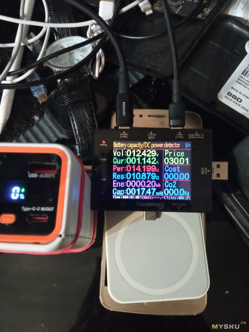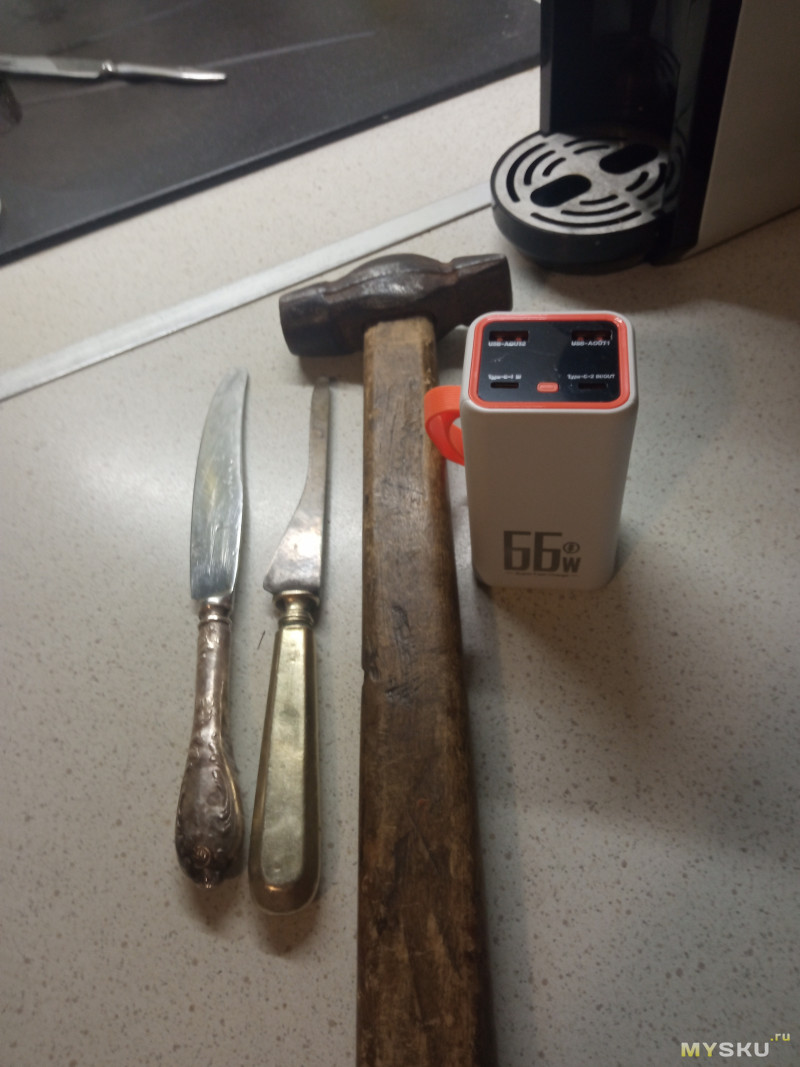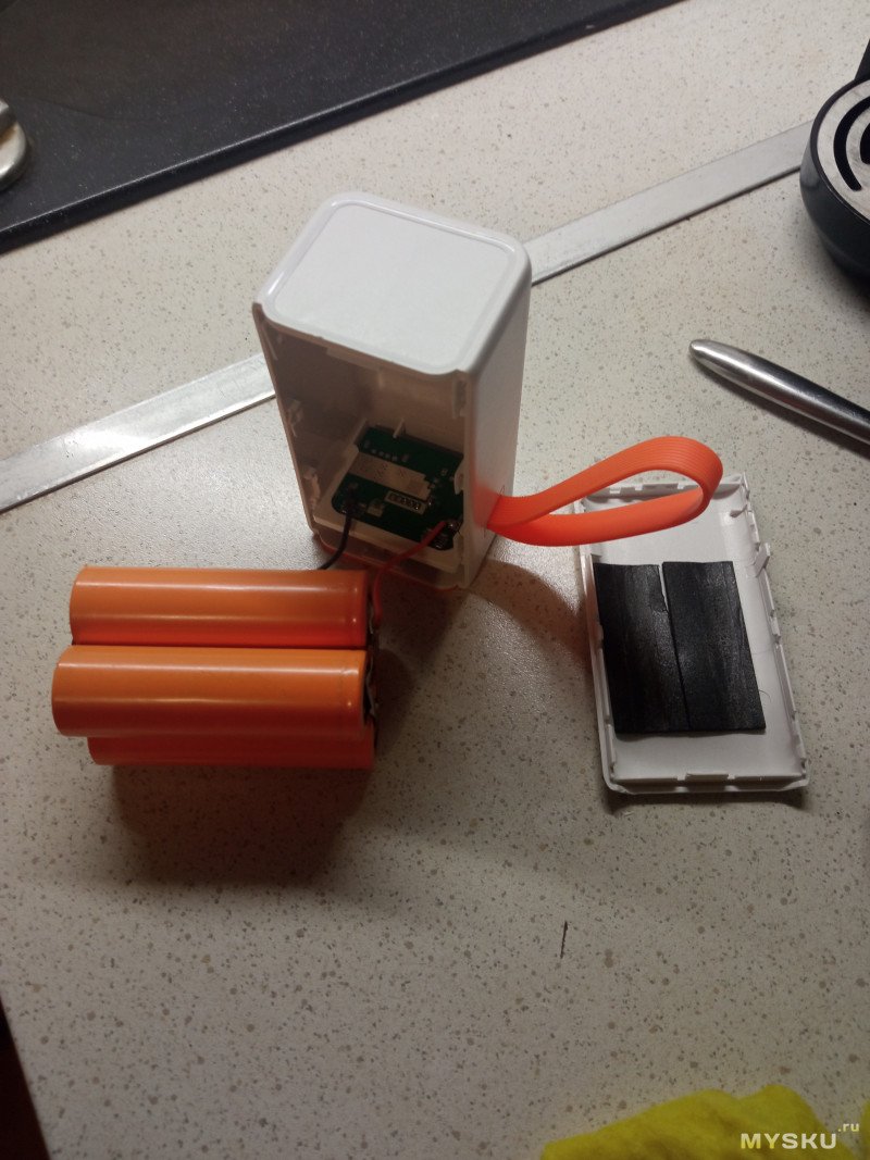У дочери телефон известной фирмы. Не андроид. Сидит в нём непрерывно в сети. При отрыве от розетки требуется допинг. Решил решить (ха-ха) проблему малой кровью. Посмотрим, что получится… На самом деле взял второй ради посмотреть, что внутри. Цвет противоположный, чтоб не перепутать при разборке. И выяснить, почему здесь нет PD на 20 вольт, ведь у аналогичного комплекта аккумуляторов mysku.club/blog/aliexpress/103082.html он есть… Для разбора взял в чёрном корпусе — меньше видно следы от вскрытия. Отгадайте, какой пришёл? Конечно белый. Ладно — буду получать стресс. Вскрыть думал снизу — как и предыдущего. Но при внимательном осмотре заметил небольшую щель на боковой поверхности. Бить буду в неё.