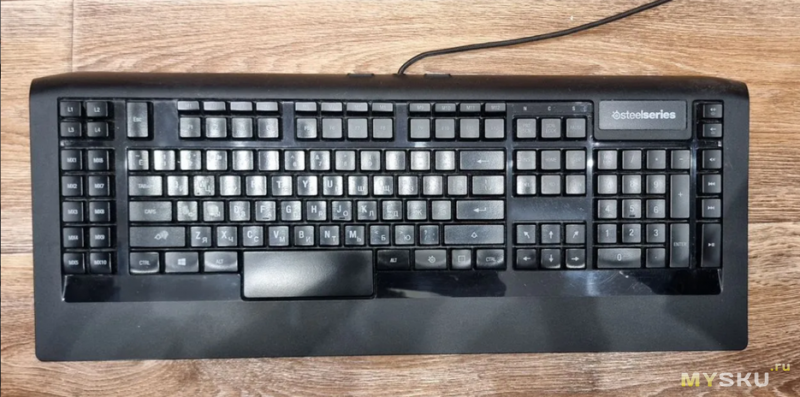 Внешне устройство аккуратное. Глянцевый пластик, скос к пользователю, резиновые ножки — всё на месте. Кнопки мягкие, нажимаются с хорошим откликом. Подсветка реализована не только в клавишах, но и по бокам корпуса. Свет мягкий, глаза не слепит. Переключается коротким нажатием на заднюю кнопку, а длинное удержание — включает или отключает её совсем. Режимов — с десяток, но управлять ими можно только вручную. Корпус выполнен добротно: ничего не скрипит, не люфтит, кнопки не болтаются. Стоит устойчиво, прорезиненные ножки спасают от скольжения. Угол наклона подобран удобно.
