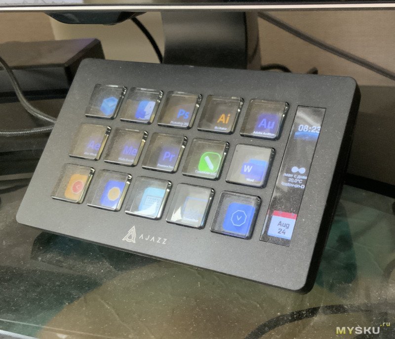 Устройство компактное, в каждой из 15 клавиш встроен мини-дисплей. Разрешение около 800×400 точек — всё видно чётко. По контуру корпуса есть подсветка RGB, режимов много, переключаются кнопкой на задней панели. Можно оставить один цвет или отключить совсем. К компьютеру подключается кабелем через USB-C разъём сзади. В комплекте кабель с переходником на USB-A), работает как с Windows, так и с macOS.