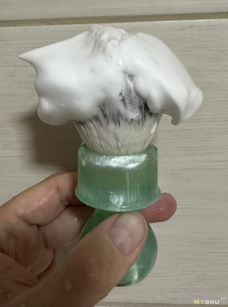 В чаше же эти помазки очень быстро (заметно быстрее барсуков) взбивают плотную тягучую пену, благодаря большому стержню и упругости узлов. Так что если вы работаете помазками в чаше, то вариант вполне себе нормальный. Также эти помазки очень быстро и легко набирают мыло из банки опять же из-за стержня и упругости узла.