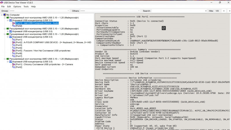 Определяется как USBAudio микрофон, есть возможность работы как с ПК, так и со смартфонами (и планшетами). Причем, с ноутбука можно выбрать, с какого микрофона записывать трек. с этого или со встроенного (удобно), на смартфоне выбор сильно зависит от возможностей приложения (приложение на выбор пользователя). Тем не менее, проблем подключить и записать пробный трек не возникло. Прикладываю скрин с USBDev с PID/VID устройства (неизвестный вендор), скрин, как определяет Win11.