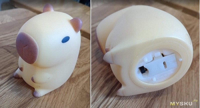 БОльшая часть сделана из силикона, только подставка пластиковая и содержит в себе всю начинку. Снизу есть переключатель режимов, а на жопку капибары выведено гнездо зарядки.