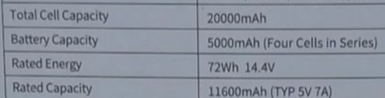 Внутри расположена ячейка на четыре батареи формфактора 21700. Это элементы INR21700-5000 от SunPower, с напряжением 3.6 В и номинальной емкостью 5000 мАч.