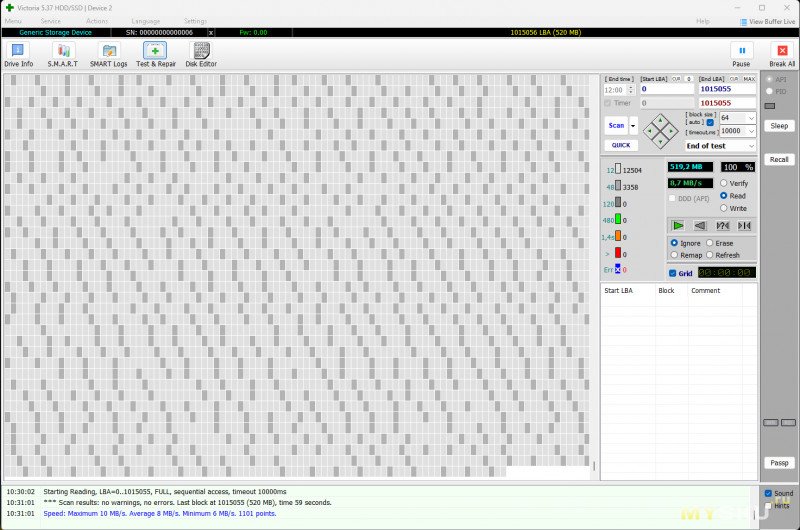 Печальное зрелище — куча сбойных блоков. Поэтому R-Undelete и работал так долго.Случай критический? Вместо того, чтобы сразу отправить карту в мусорку, запускаю H2testw: