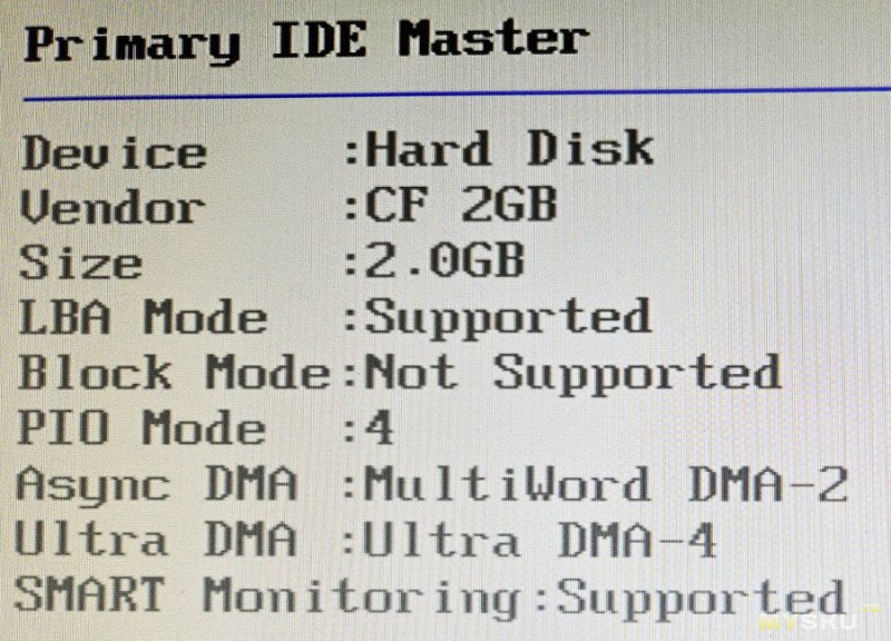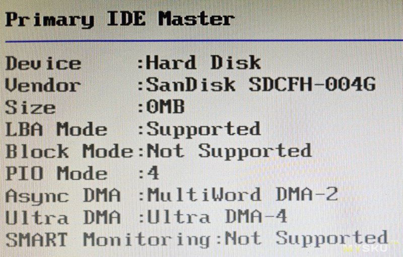 В BIOS диск появился, но объём неизвестен, и SMART не поддерживается. Зато есть модель — SanDisk SDCFH-004G. Лучше бы оригинальную наклейку не трогали…