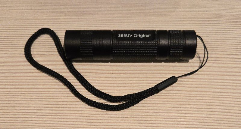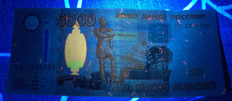 Заявлена волна 365нм, визуально невооружённым взглядом светится нежно-голубым. Защитные элементы на банкнотах и ценных бумагах светятся чётко и разборчиво, можно выявлять фальшивки.