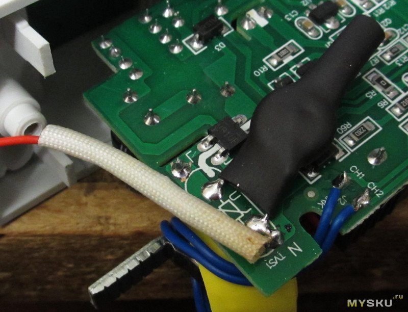 Следы переделки для подключения входа снизу — приваренный к контакту реле родной провод подающий фазу отпаян от платы и заизолирован (на случай если потребуется переделать обратно), с другой стороны реле припаян провод в силиконовой изоляции: