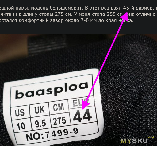 Как показал опыт прошлой пары, модель большемерит. В этот раз взял 44-й размер, который согласно размерной сетке рассчитан на длину стопы 27,5 см. У меня стопа 28,5 см, она отлично поместилась в кроссовке, при этом остался комфортный зазор около 7-8 мм до края носка.