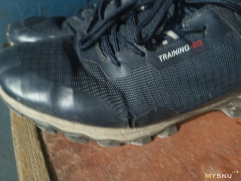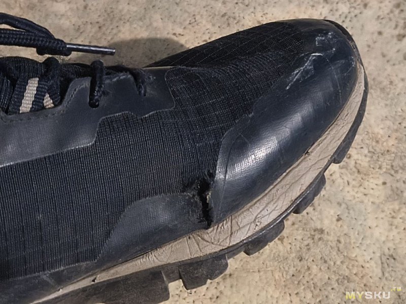 Следы износа. У меня почти во всей обуви без берца за сезон начинает прорываться ткань на внутренней стороне задника. Также случилось и с этой парой.
