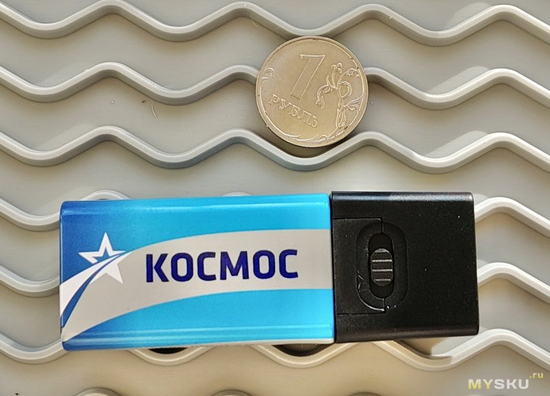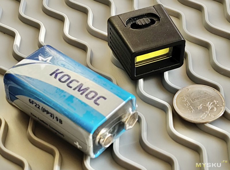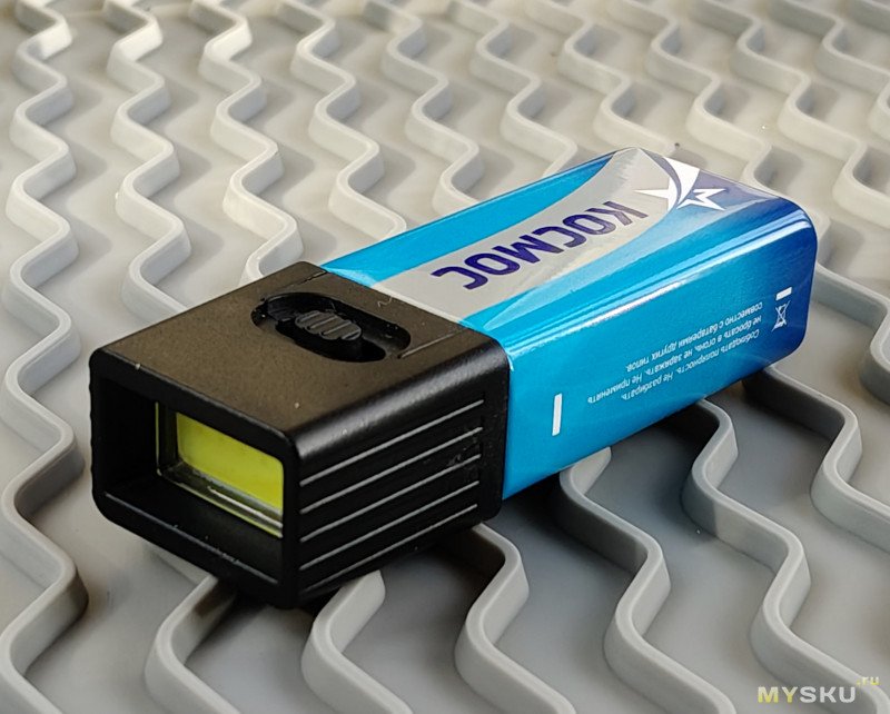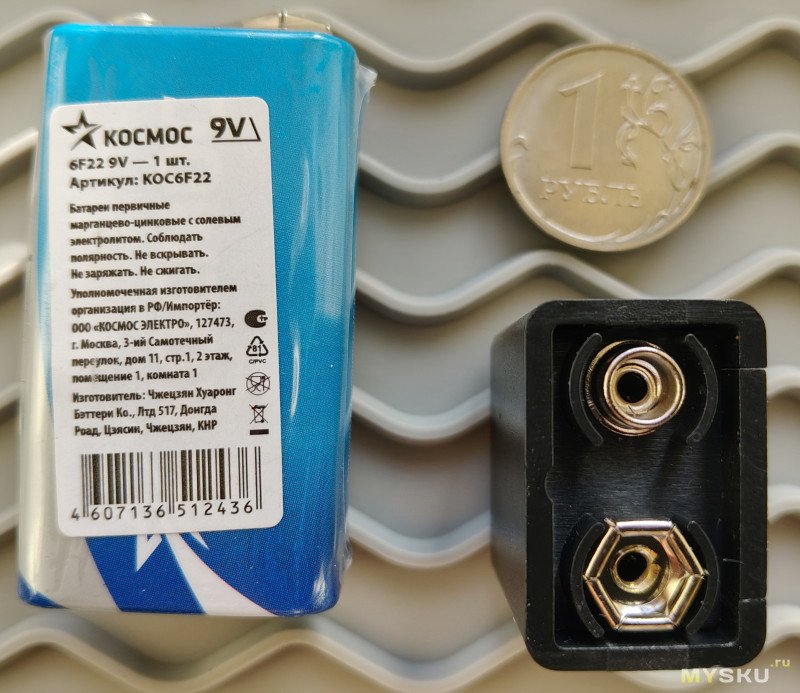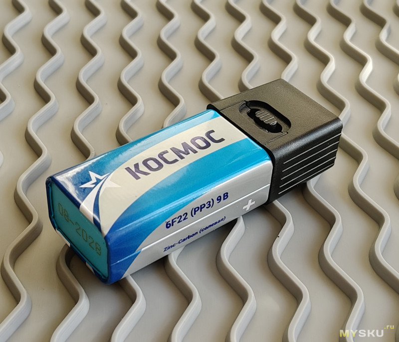 Питается чувак от батареек «Крона», в моём случае — солевая 6F22 (PP3) 9V «Космос» (35 руб.), для эпизодического использования мне кажется её достаточно.