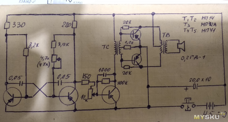 котанультразвуковое нечто, недавно обзор был)) как подарили эту штуку, так и лежит, не включал, нет доверия.во-первых, обмотки в цепи баз двух транзисторов усилителя мощности включены последовательно с резистором 1.2 кОм, и если ставить цель громкость или максимум усиления, то этот резистор имеет смысл шунтировать электролитическим конденсатором.