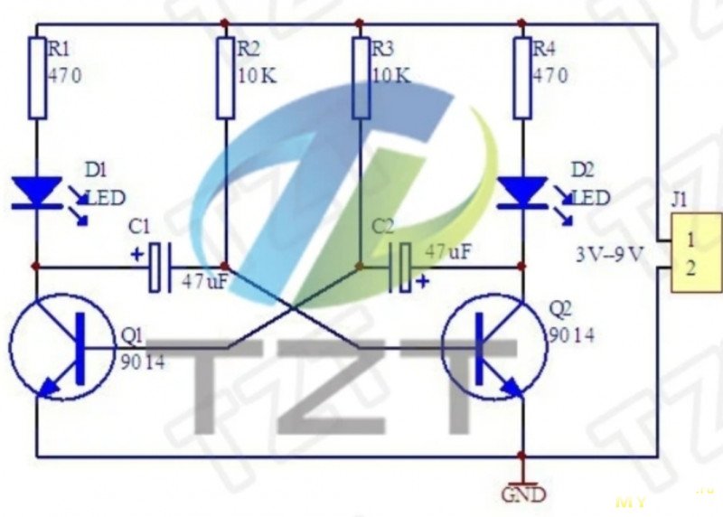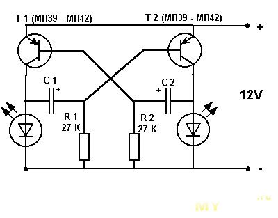 когда один из транзисторов запирается, база второго через конденсатор и светодиод подключается к 12В, что влечет короткий импульс тока базы и этот транзистор отпирается, его сопротивление падает до единиц Ом.