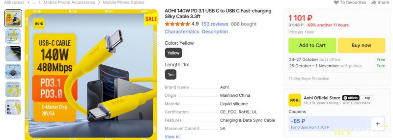 А вот гибкости хотелось бы побольше, уже привык к очень мягким кабелям, это очень удобно. Настолько, что пожалуй, буду искать ещё, 140 Вт с чипом и более мягкий чем этот. Ну и с ценой в пределах разумного. А пока придется этим пользоваться, всё равно у меня сейчас для него замены нет.