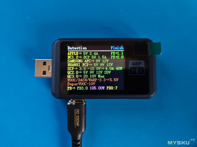 Для начала проверил: данные передаются, скорость проверить мне нечем. Да и не вижу особого смысла: она тут заявлена всего 480Mbps, это обычный USB2.0. В общем, покупать его для этих целей не самая лучшая идея, не для того он. Но данные передает, может и в таком качестве пригодится, если, например ничего лучшего под рукой нет, а вот он есть.Дальше проверил чип. Он тут есть, в характеристиках с длиной наврали, по току позволяет те самые 5A, по напряжению не только 28В, а даже и 50В. Т.е. и 140 Вт и 240 Вт в теории должен разрешить передавать.