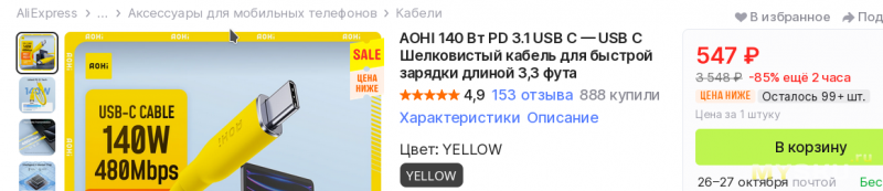 Использовать гибкие термостойкие «силиконовые» кабели с паяльником очень понравилось, а поскольку у меня уже было ЗУ 140Вт и про мощный паяльник уже вовсю раздумывал, то когда этот кабель подвернулся в рекламе, заказал его «на перспективу».Скриншот заказа
