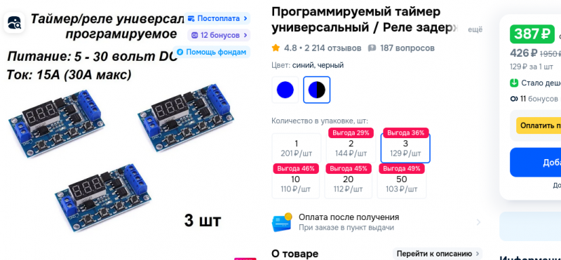 Мне тут понадобилось «задерживать» на несколько секунд (настраиваемо) +12В после пропадания сигнала. И две штуки. Хотел собрать на макетке, полез на «Озон»… А там за 129 уже плата, микроконтроллер, MOSFETы, экран, кнопки, готовая программа… Дешевле точно не сделать.