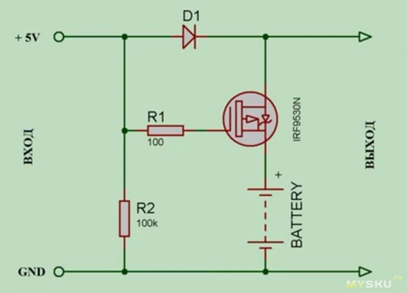 замечательно. В IRF9530 встроенный диод никак не смущает? Через который на разряженную батарею (у которой импеданс может быть очень низкий) потечет ток заряда от источника. Большой ток. Дальше описать ситуацию или сам?