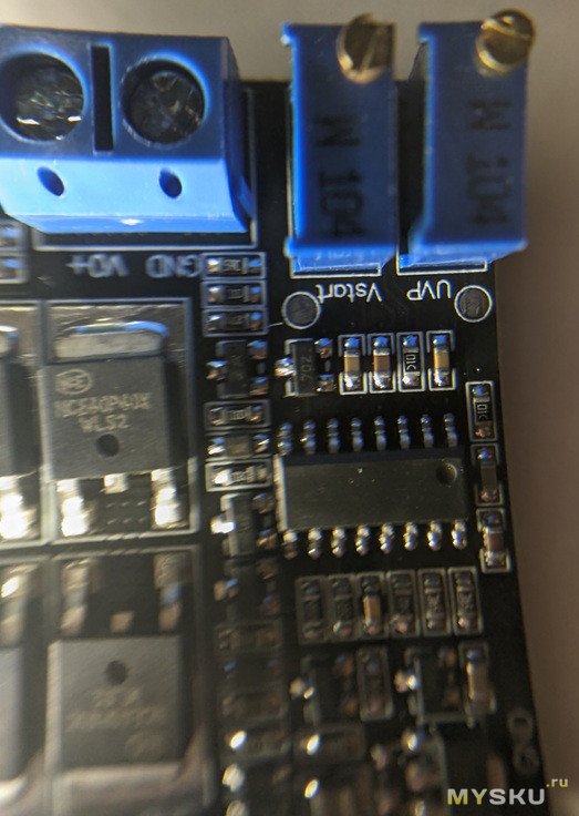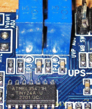 Как видим по фото, на плате есть два синих резистора подстроечных (потенциометра) W104. А так же два контакта возле них — UVP и Vstart.
