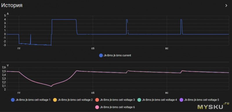 У меня связка такая: 4 банки литий-железо-фосфата выходят на BMS. На BMS есть вход — к нему идёт зарядка и выход. Он идёт на автомобильный инвертор (220v) и на данный переключатель нагрузки. Всё вместе — это уже уровень какого-нибудь аккумулятора, по типу Ecoflow (ну я конечно преувеличил, но плюс-минус принцип схож). Но цена такого готового решения на ~380W в разы выше моих 4 банок, зарядки, инвертора, переключателя нагрузки и BMS. Когда батарея заряжается, на выходе напряжение есть! Ведь по сути зарядка работает по принципу CC/CV, плюсовой контакт общий, от батареи, минусовой на BMS от зарядки и от нагрузки разный, хотя в инструкции к BMS писалось, что можно подключить и нагрузку и зарядку к одному контакту. Поэтому при отключении света, даже, если аккумулятор был на зарядке, идёт без проблем переключение, потому, что на контактах всегда напряжение есть.