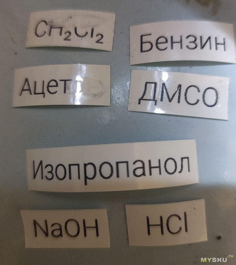 С химической стойкостью надписи всё тоже неплохо — я тёр каждую надпись ватной палочкой с соответствующим растворителем, и сработали только ацетон и хлористый метилен. Доместосом, кстати, тоже тёр, не повлияло.