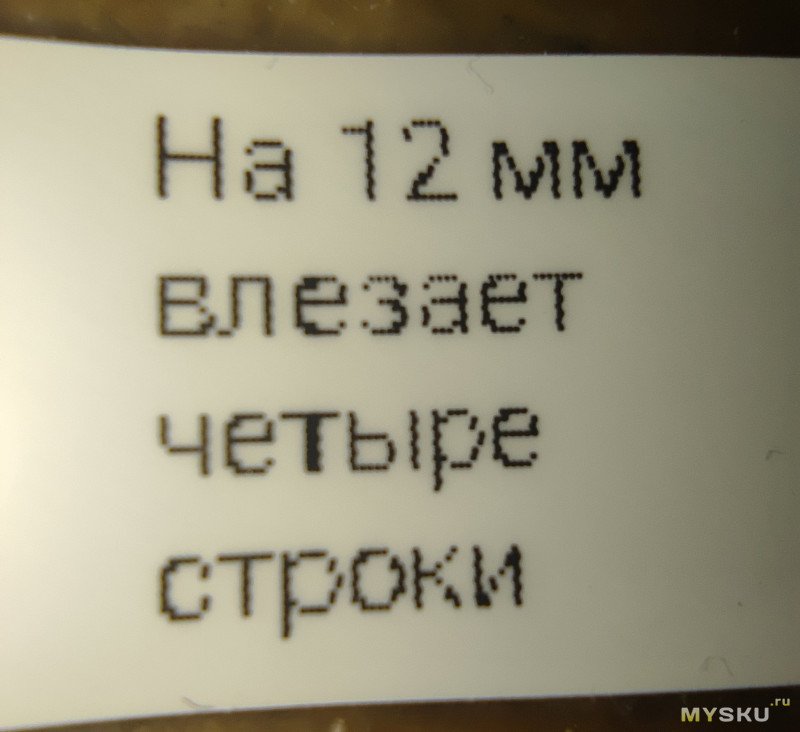 Принтер может печатать крошечным шрифтом, строками по 3мм. При этом пиксели видны, но текст чёткий и хорошо читаемый (левая часть фото, увы, немного не в фокусе — побочный эффект макросъёмки). Не то чтобы такой мелкий шрифт часто был нужен, но приятно, Brother поддерживал строки только по 6 мм.