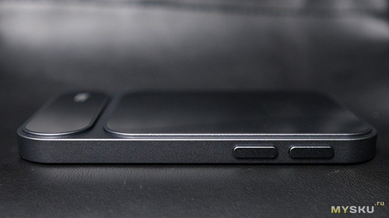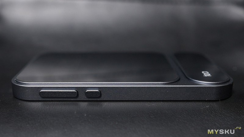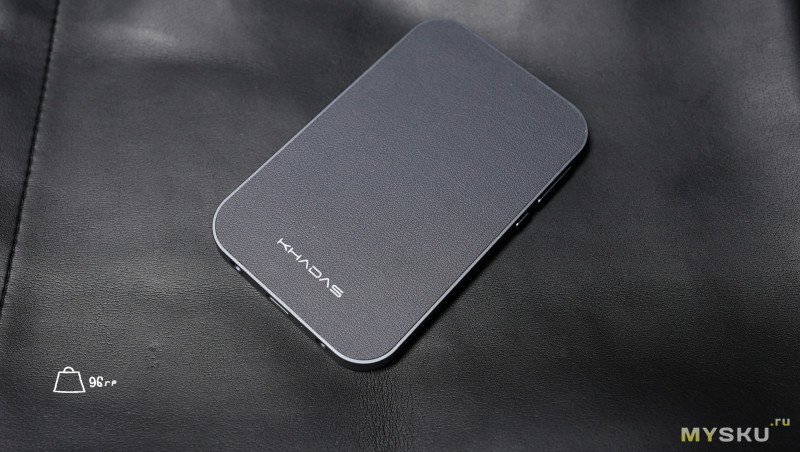 На обратной стороне вставка из материала под модным ныне названием экокожа. Эта сторона магнитная, использует MagSafe при примагничивании к задней стороне яблочных смартфонов. Общий вес ЦАПа чуть меньше 100гр.