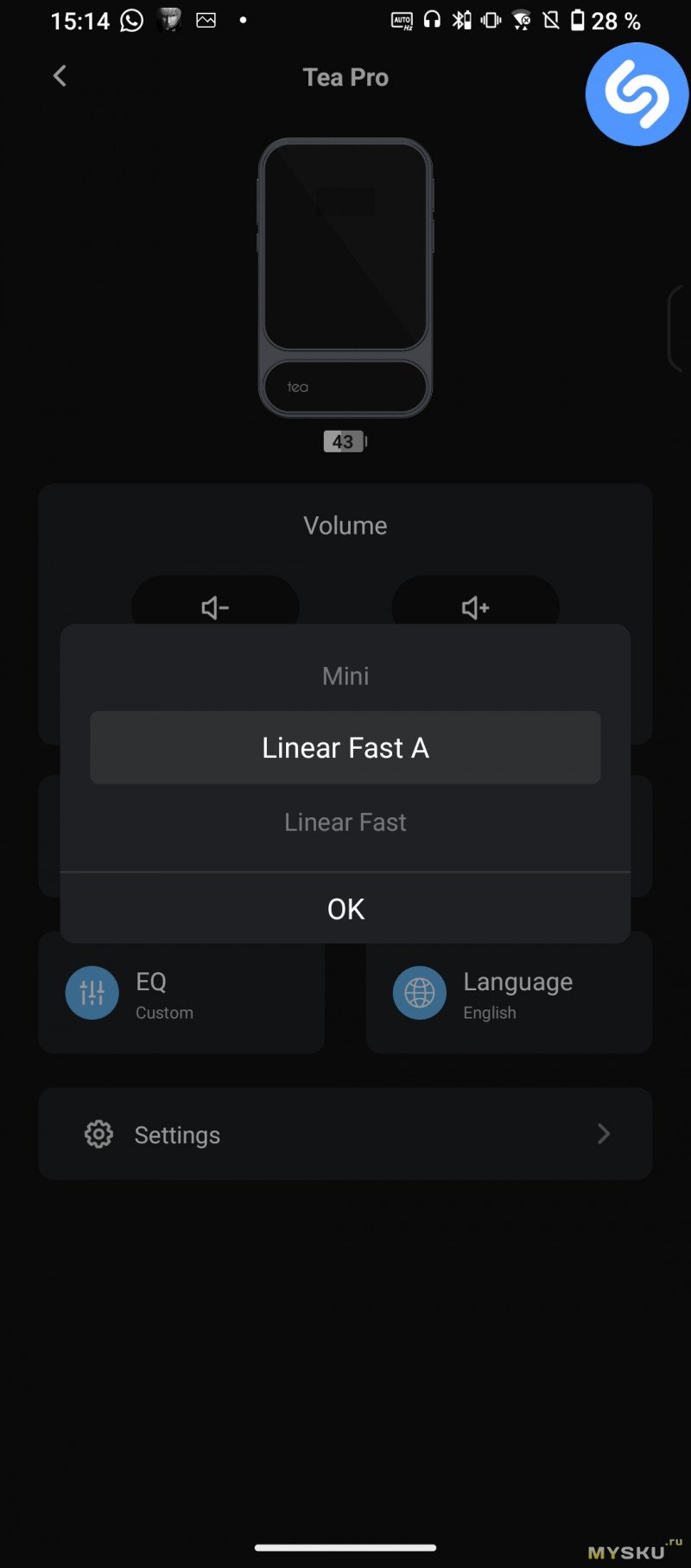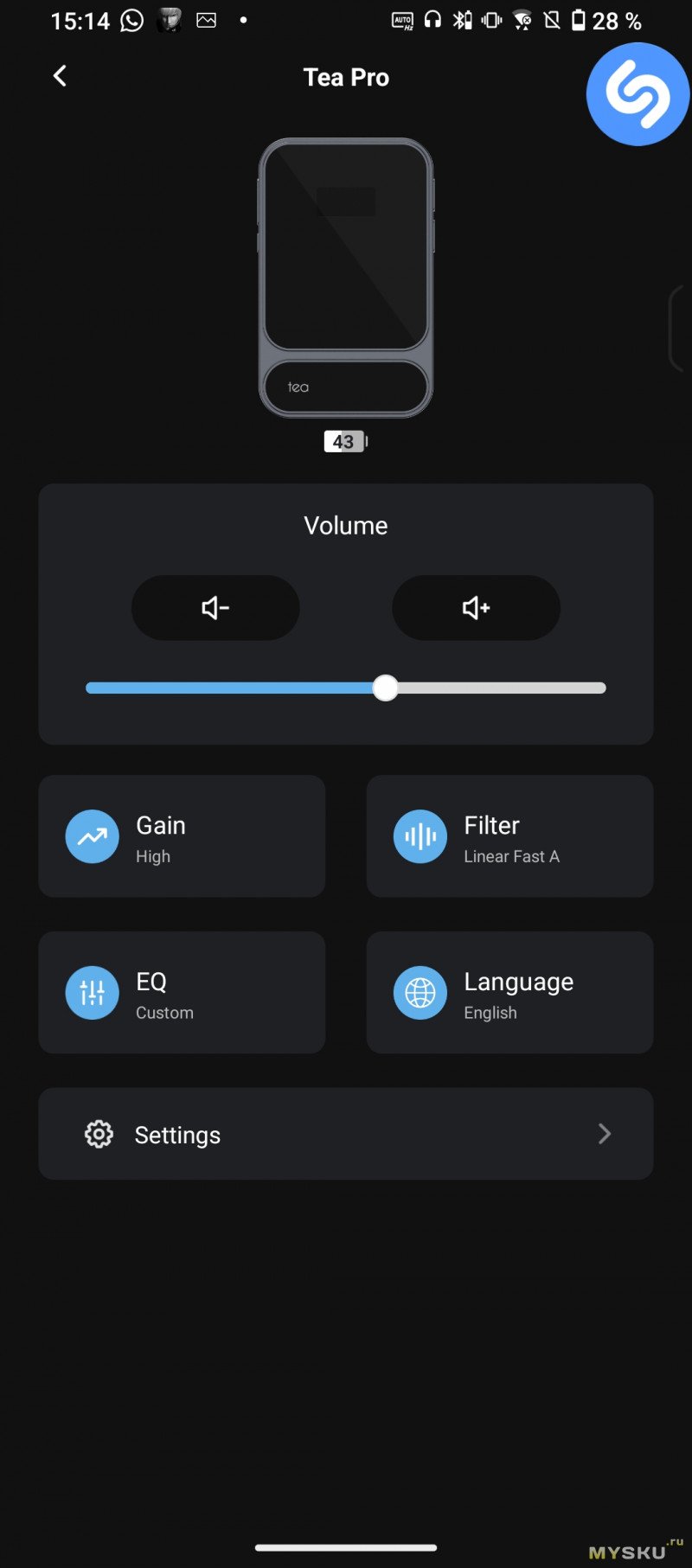 Приложение называется Khadas Audio и свободно скачивается из PlayMarket и AppStore. Настроек немного — режимы Gain, фильтра, ручная настройка эквалайзера по частотам (31Гц — 16 кГц), громкость, обновление прошивки, отображение уровня заряда.![]() | ![]() | ![]() |