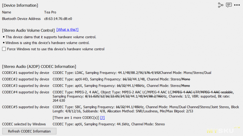 Набор аудиокодеков богат и поддерживает в том числе AptX HD и LDAC.ОС Windows по умолчанию выбирает AptX, что тоже неплохо.