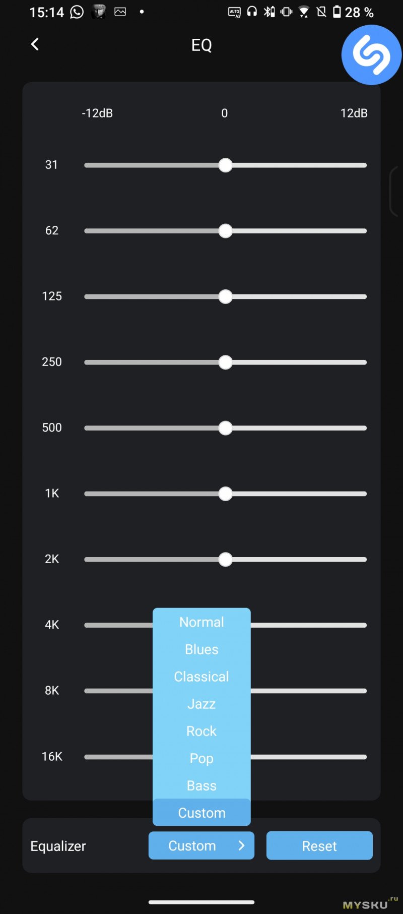 В эквалайзере имеется 8 предустановленных пресетов + кастомный пользовательский режим, где есть регулировка по частотам, но сие доступно только через мобильное приложение.