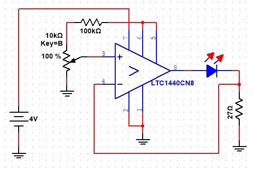 При таких номиналах ток через светодиод регулируется от 0 до 4мА.