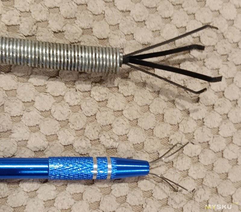 Приобрел цанговый захват для мелких радиоэлементов. Проволока довольно жесткая, но при желании можно подогнуть. Конструкция разборная, откручивается кнопка, и выталкивается в сторону захвата. Довольно удобный, стоит дешево.