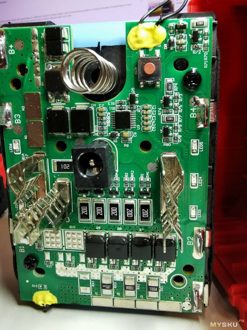 Интересный момент, на плате зачем-то установлено два разъема для зарядки аккумулятора один сбоку, как обычно, и один сверху. Кроме того, аккумулятор успешно заряжается через стандартный контакт. Я не имею фирменной зарядки Makita, поэтому не могу сказать будет она его заряжать или нет.